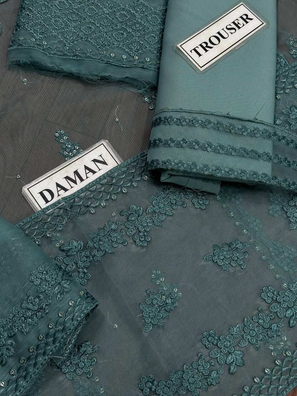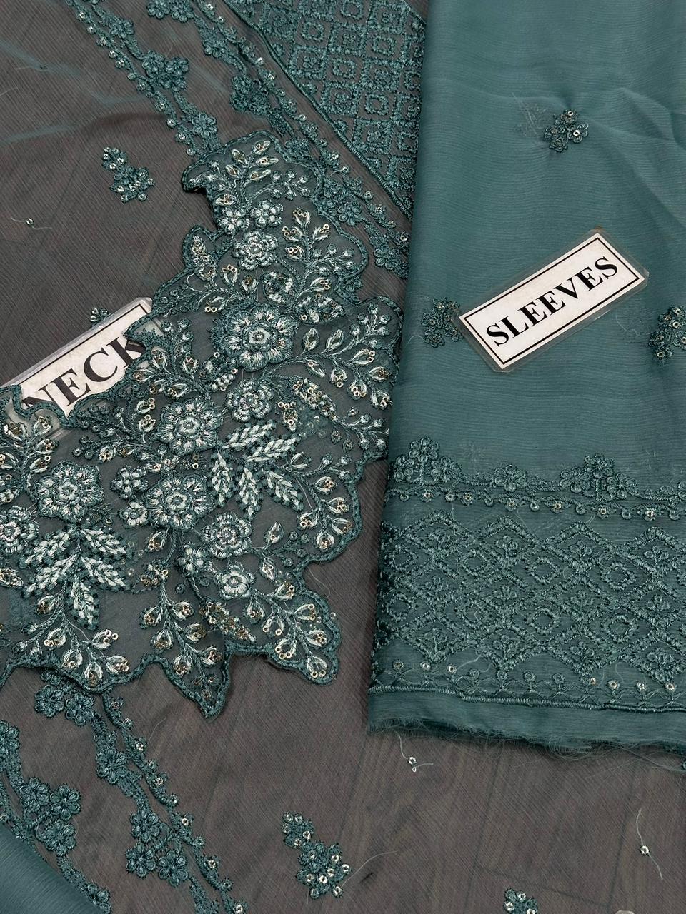 An elegant chiffon unstitched suit featuring refined sequence embroidery, paired with a comfortable malai trouser.