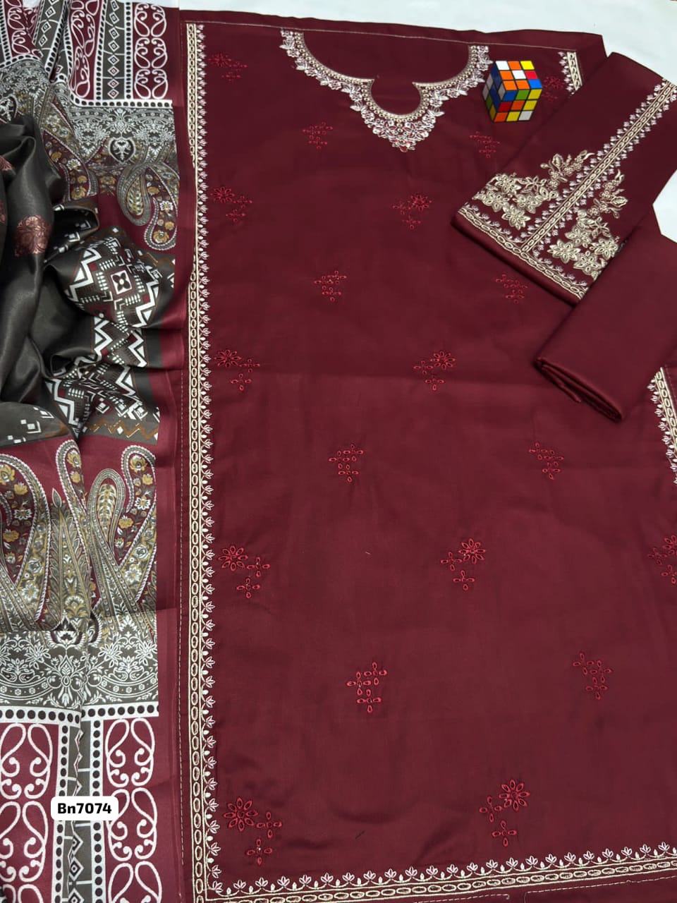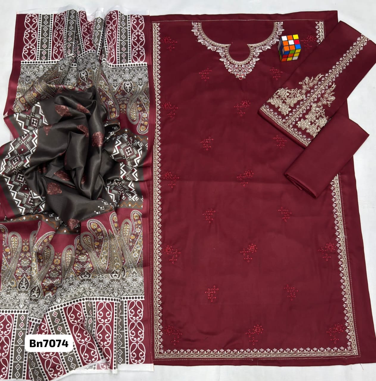 A premium quality Dhanak suit featuring full boring embroidery on the front, detailed sleeves, and a stylish printed twill shawl.