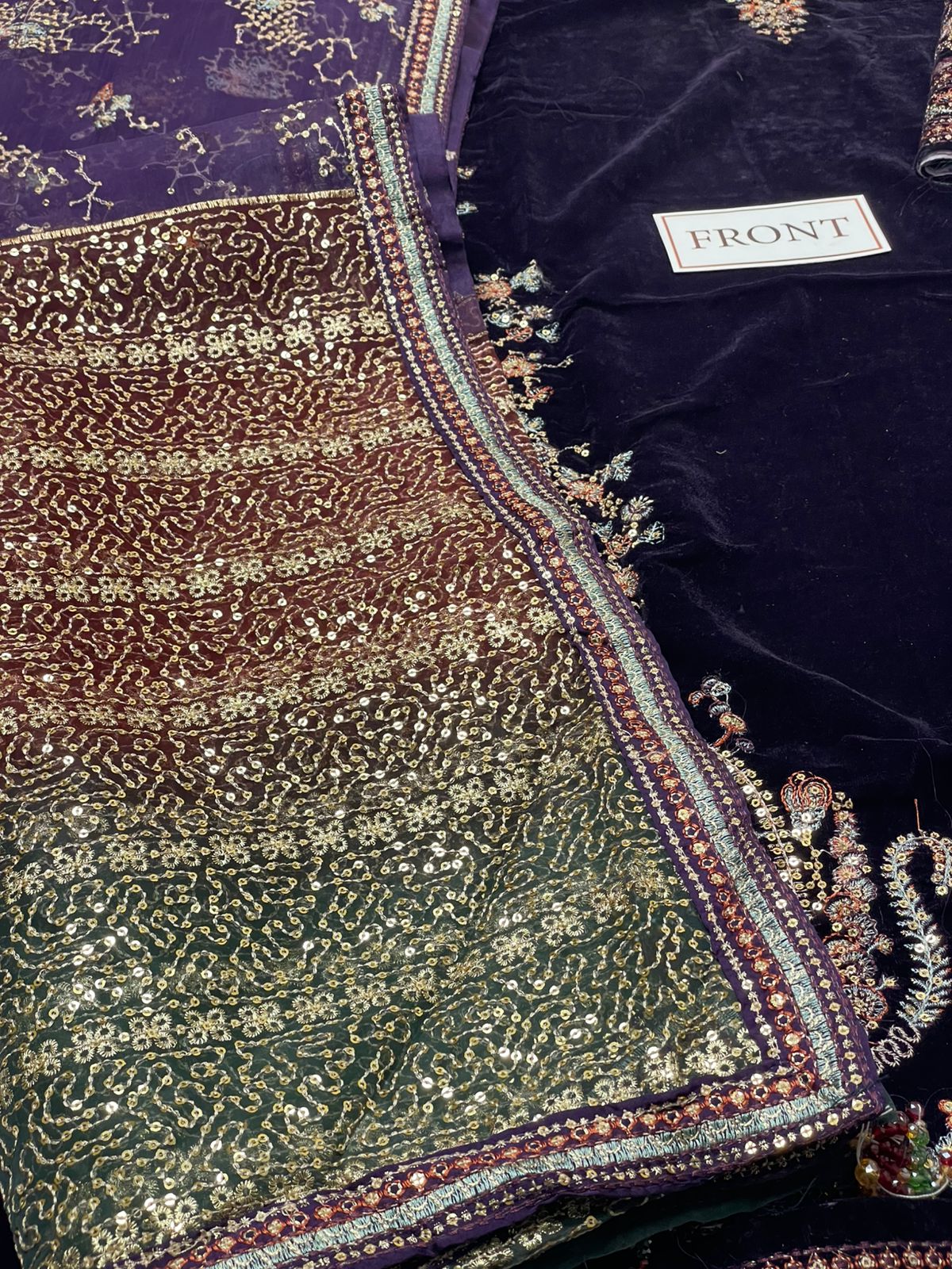 Front: Velvet fully heavy alternate embroidered spangle work with embroidered daman lace and chak lace
