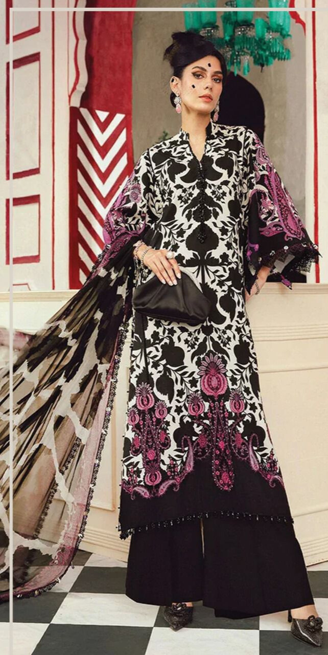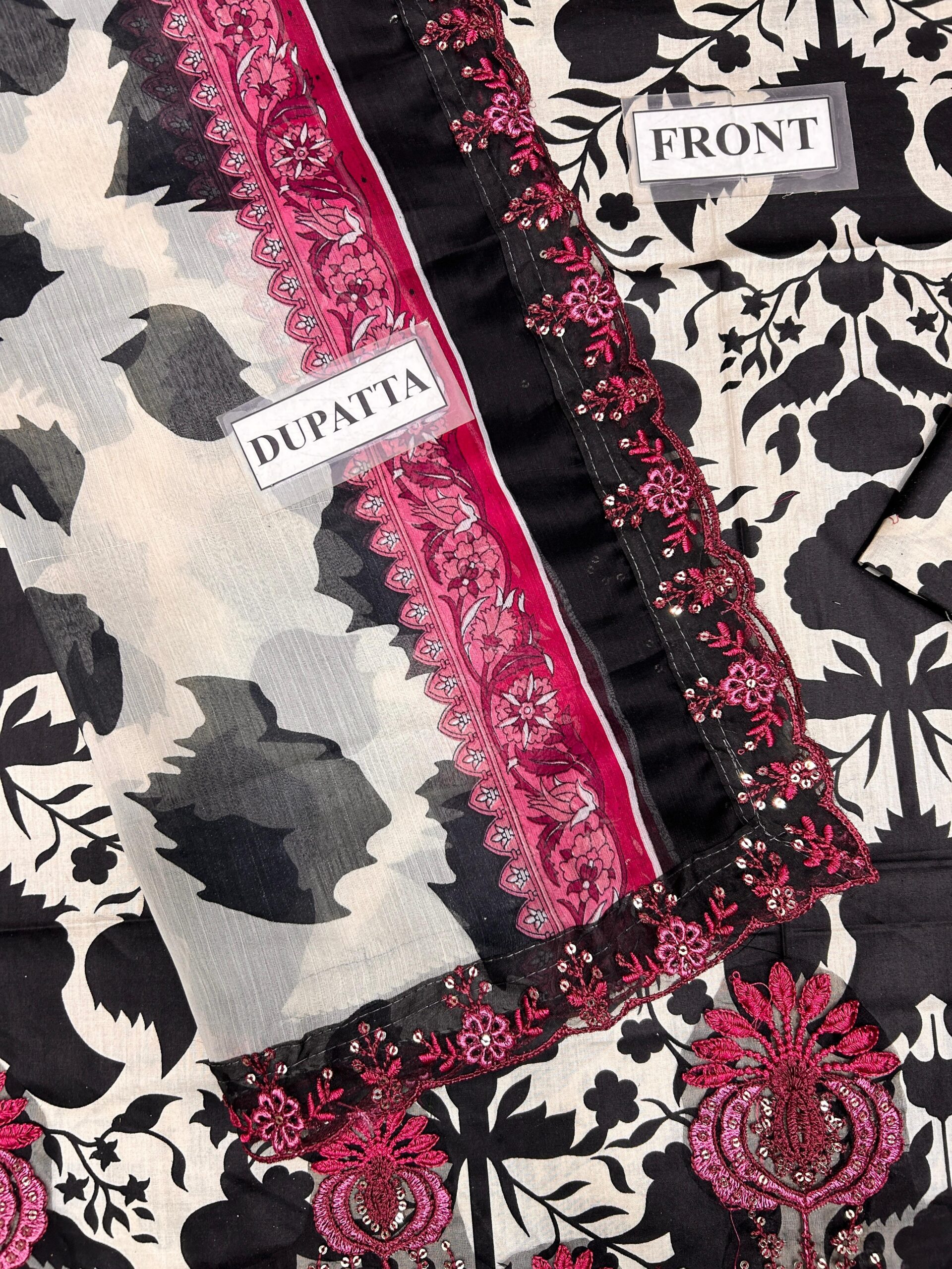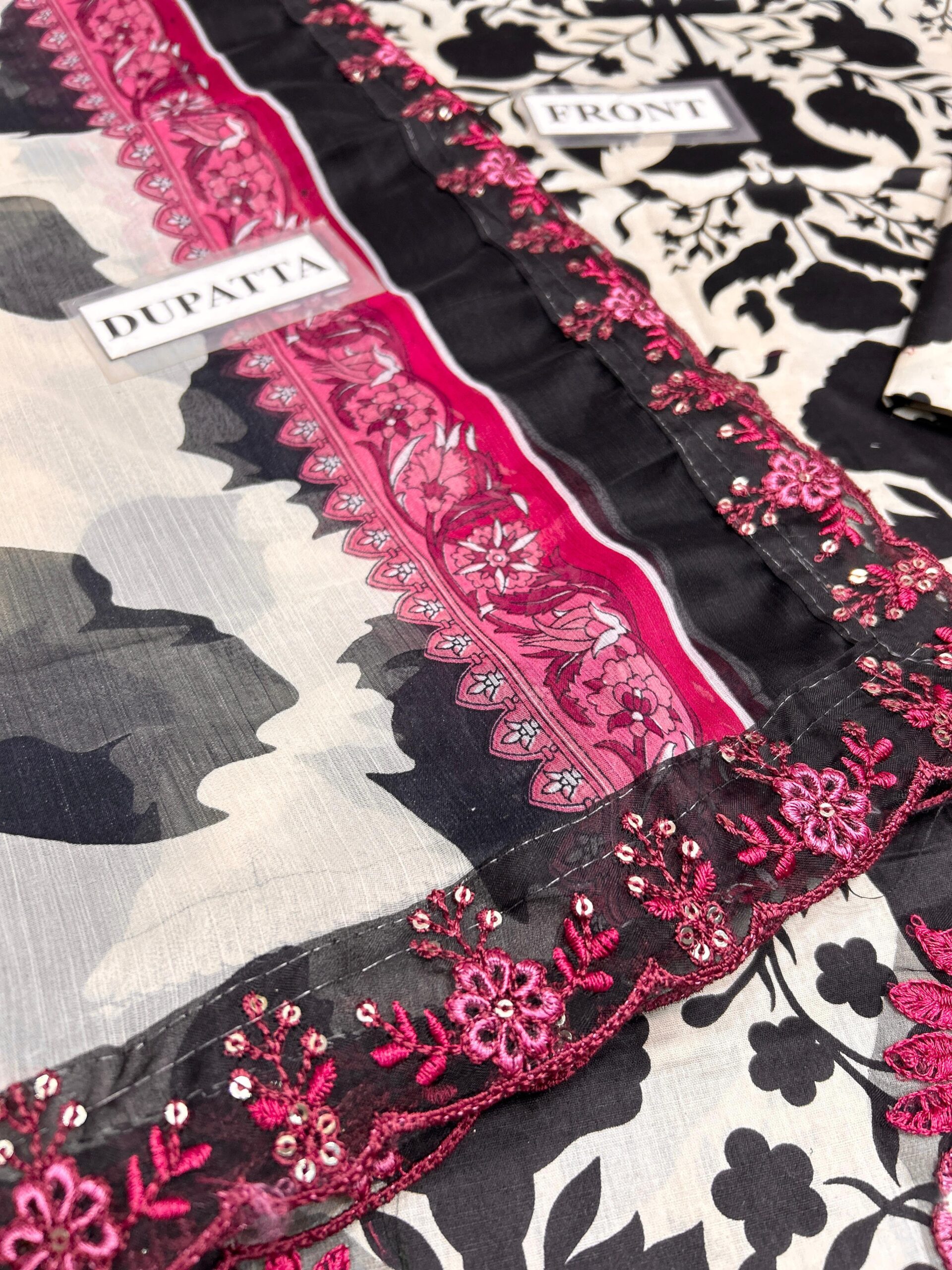 Dupatta: Printed chiffon dupatta with 4-side embroidered borders (ready to wear)