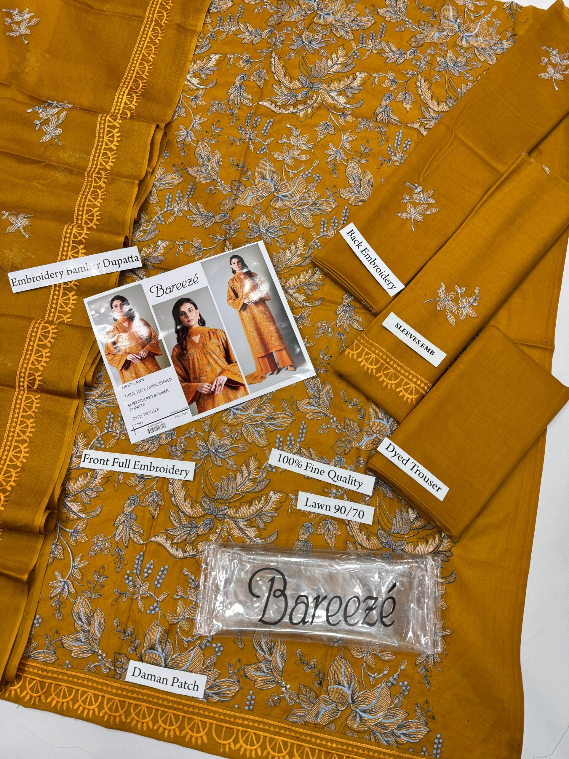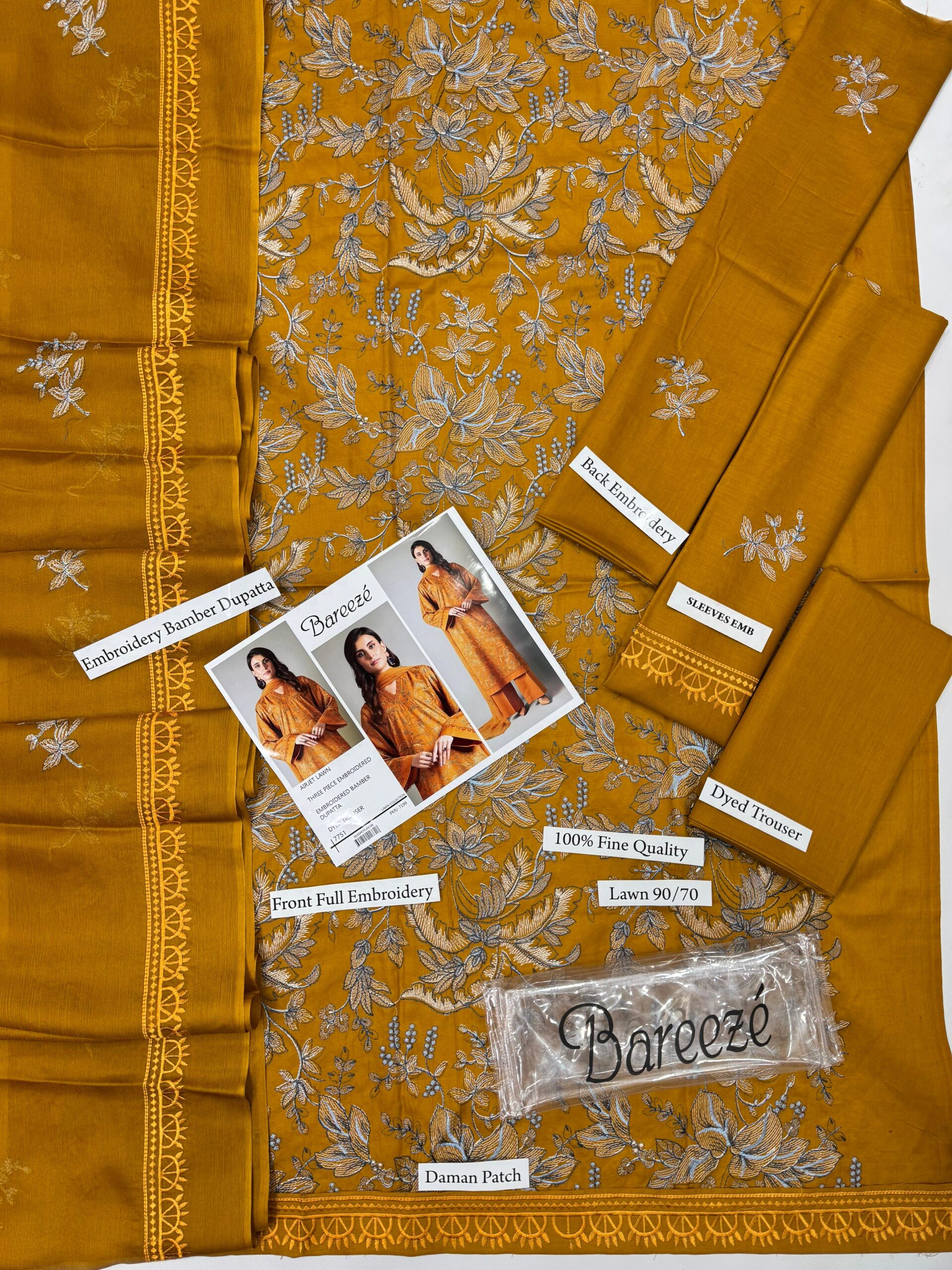 Step into summer elegance with this premium Bareeze mustard yellow floral embroidered lawn 3 piece suit, beautifully crafted with delicate all-over floral embroidery.