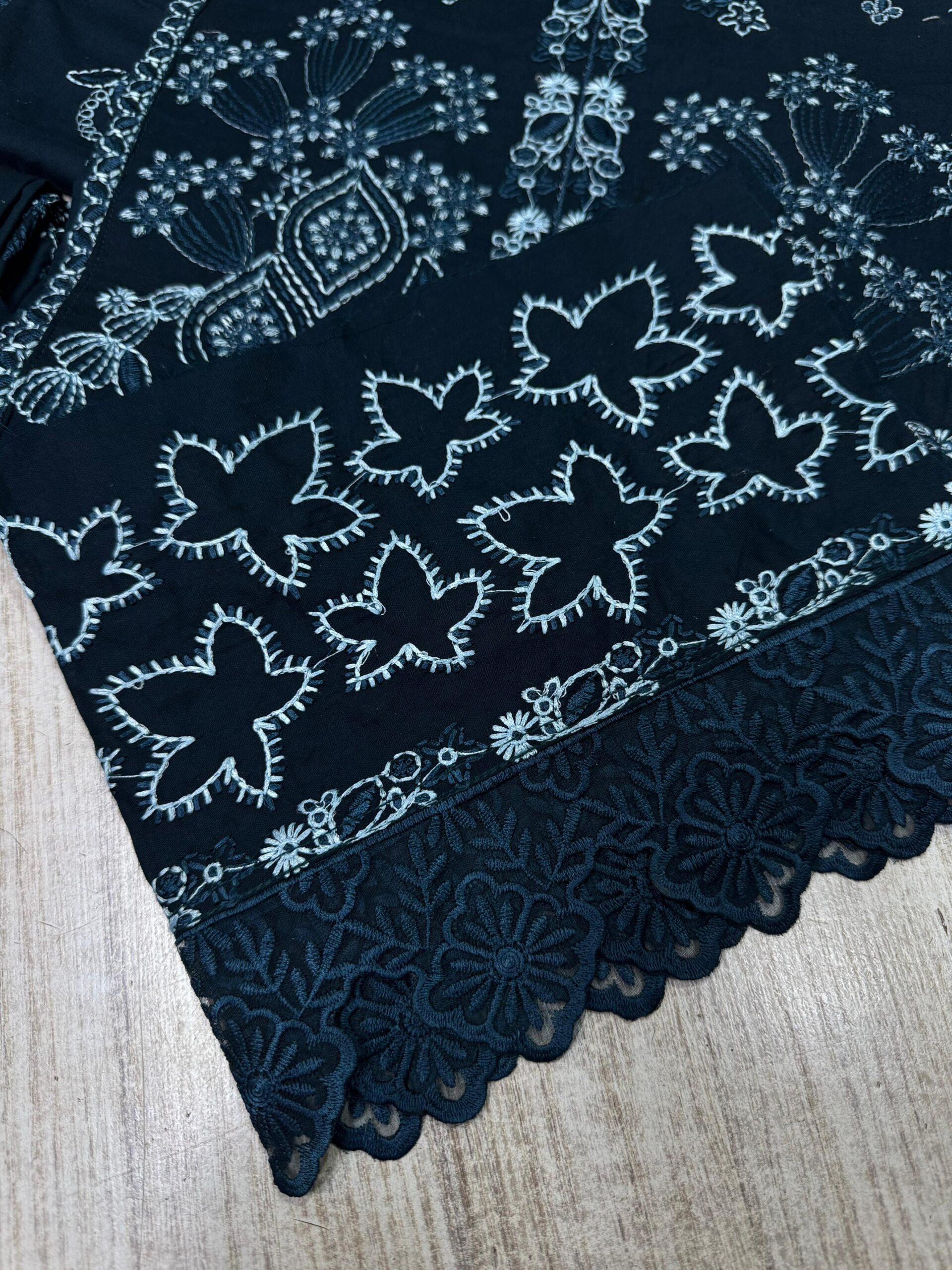 An elegant cambric cotton unstitched suit featuring fine thread embroidery with a graceful khadi net organza dupatta.