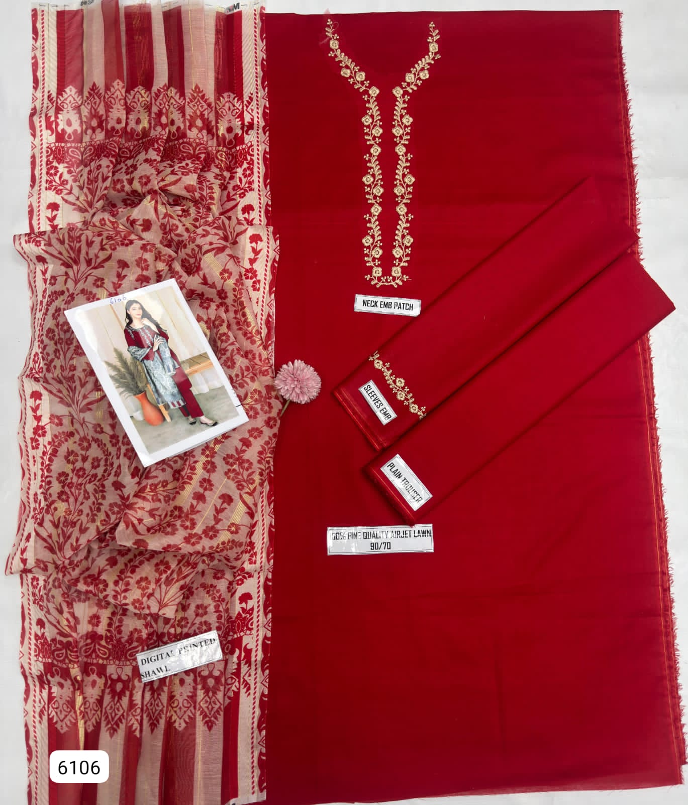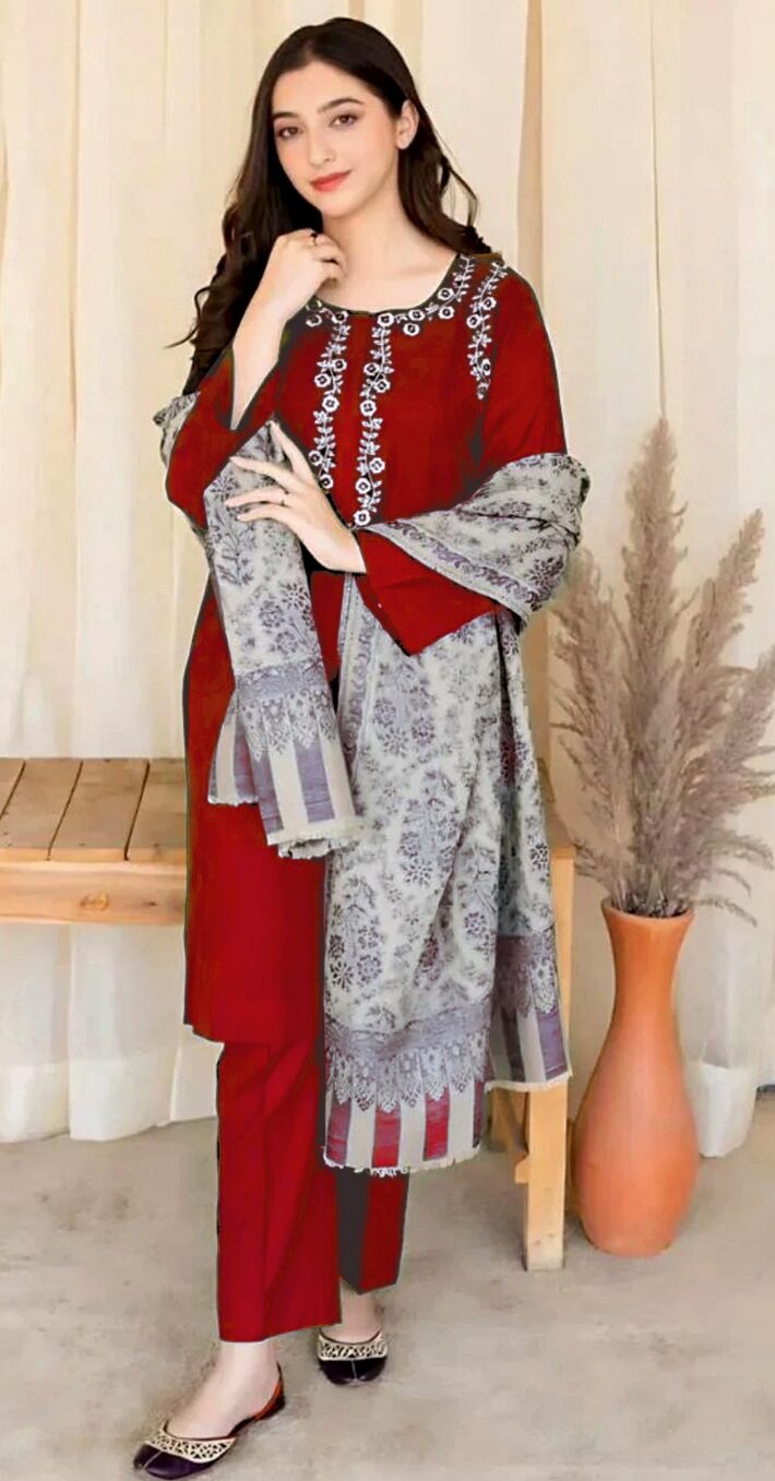 Enhance your summer elegance with this Rose Red 3 Piece Embroidered Lawn Suit , featuring heavy embroidered sleeves and a premium digital printed dupatta.